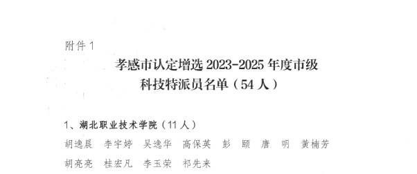 (本网讯 王雪芳)为深入贯彻习近平总书记关于推进科技特派员制度重要指示精神,落实《中共湖北省委湖北省人民政府关于做好2022年全面推进乡村振兴重要工作的意见》《湖北省万名科技特派员助力乡村振兴行动方案》等文件精神,充分发挥我校科技人才优势,在征集教师个人意愿,学校考察的基础上,推荐了胡逸晨等11名同志为市级科技特派员,现已被孝感市科技局认定为2023-2025年度市级科技特派员。