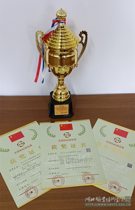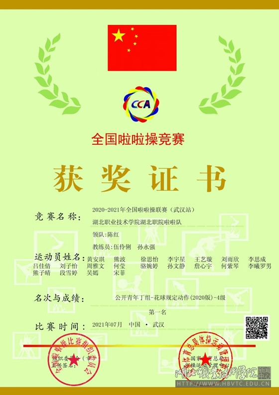 (本网通讯员:孙永强)2020-2021年全国啦啦操联赛(武汉站)日前圆满落下帷幕,我校代表队以第一名的成绩荣获公开青年丁组花球规定动作(2020版)冠军,公开青年丁组-花球校园啦啦操示范套路第三名的优异成绩,学校体育部教师孙永强、伍伶俐作为指导教练荣获“优秀教练员”称号。
