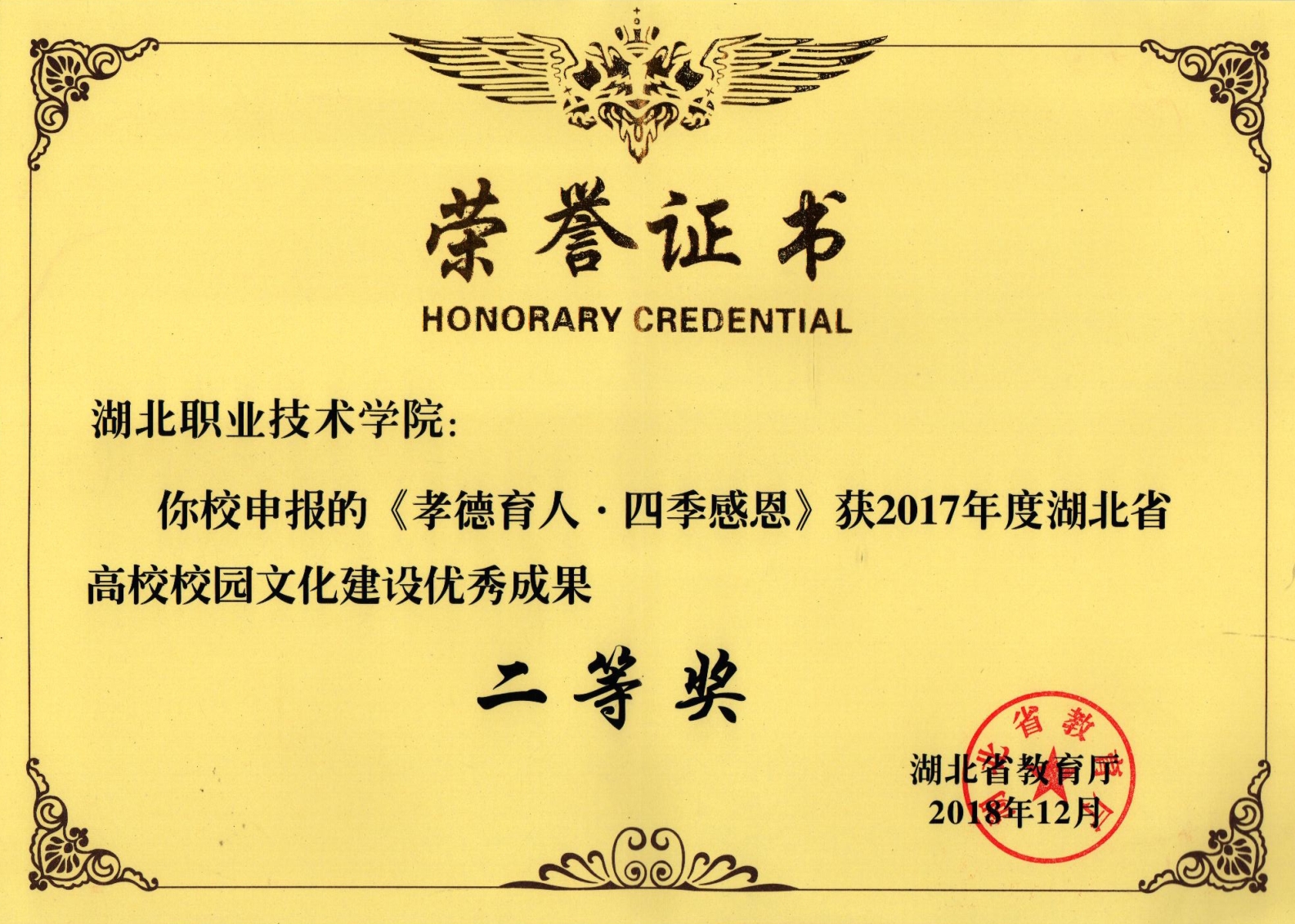 我校选送的《孝德育人˙四季感恩——江南官方注册_江南(中国)官方创新校园文化工作机制案例》荣获湖北省2017年度高校校园文化建设优秀成果二等奖;党委宣传部吴春花、熊元焕、陈灏老师撰写的《扬零着意 润物成形——高职院校诗教育人实践探微》论文获纪念湖北省高等学校校园文化研究会成立30周年学术论坛征文二等奖。
