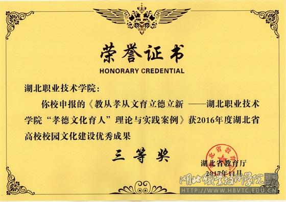 我校选送的《教从孝从文 育立德立新——江南官方注册_江南(中国)官方“孝德文化育人”理论与实践案例》荣获湖北省2016年度高校校园文化建设优秀成果三等奖;《建“红网” 育“网红”——江南官方注册_江南(中国)官方网络文化育人工作经验交流材料》入选2016年湖北省高校校园文化建设优秀成果集。