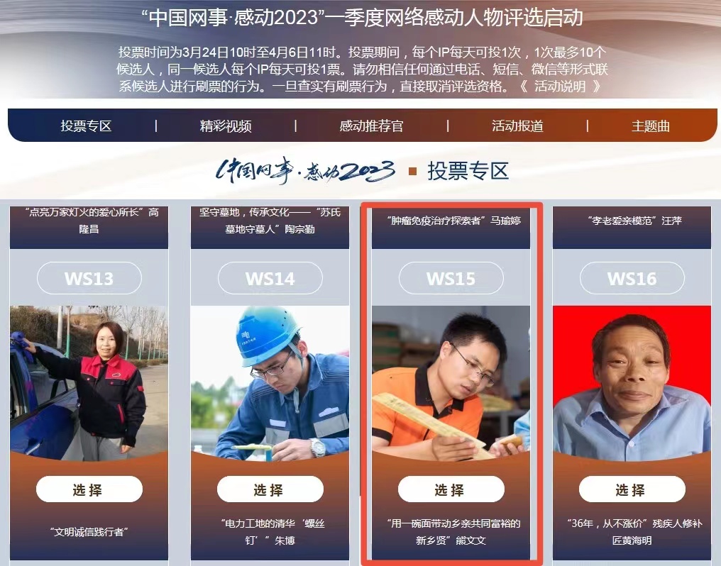 近日,“中国网事·感动2023”二季度网络感动人物评选活动启动,我校2020级优秀学子熊文文同学被列为候选人。目前进入网络投票阶段,熊文文同学网络投票编号是第15号,即 WS15。投票网址:http://news.cn/gongyi/zt/zgws/2023zgws02tp/index.html