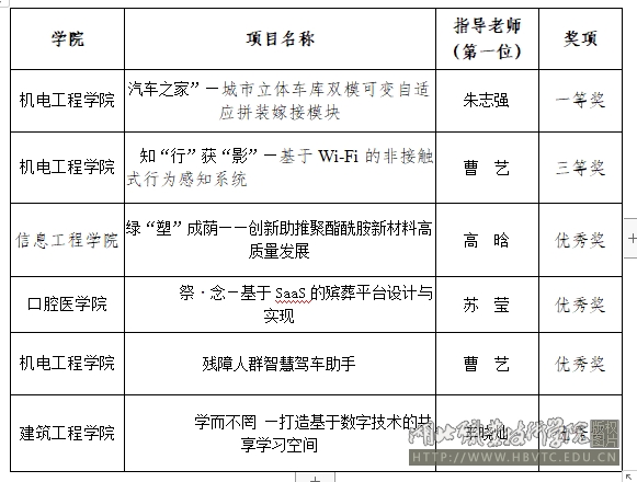 (本网讯 艾欢) 6月16日,2023年度“才聚荆楚·创立方”孝感市创新创业大赛在博物馆文化中心举行。全市共有15个项目进入选拔赛。我校口腔医学院、机电工程学院、信息工程学院、建筑工程学院组建6个团队参赛,其中机电工程学院《汽车之家”——城市立体车库双模可变自适应拼装嫁接模块》以第一名获得一等奖,《知“行”获“影”——基于Wi-Fi的非接触式行为感知系统》以第四名获得三等奖,其他4个项目获得优秀奖。《汽车之家”——城市立体车库双模可变自适应拼装嫁接模块》《知“行”获“影”——基于Wi-Fi的非接触式行为感知系统》将进入省赛。