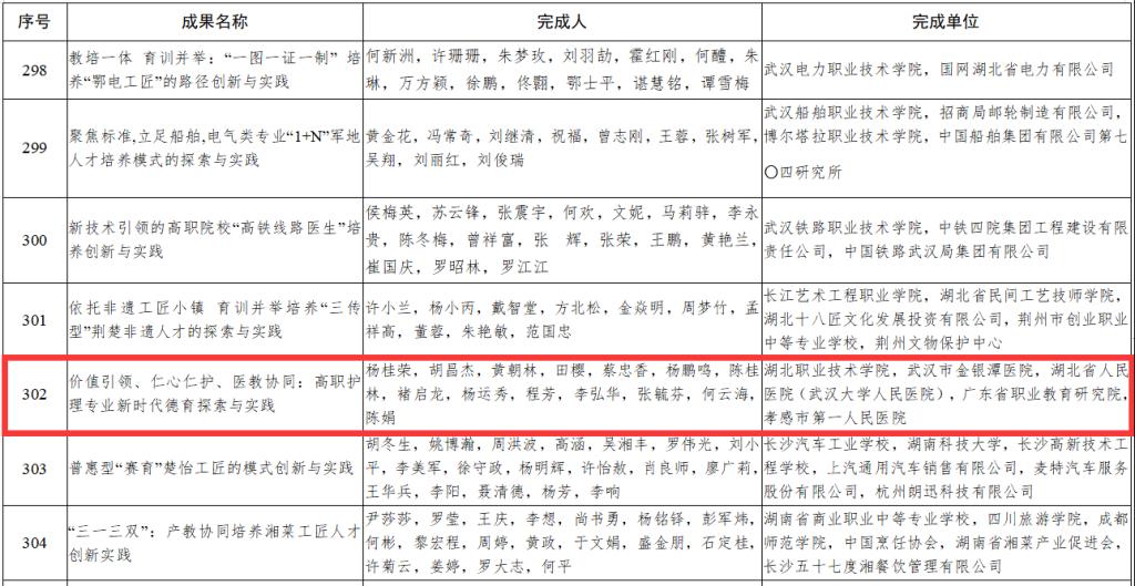 其中,由学校主持的获奖成果《价值引领、仁心仁护、医教协同:高职护理专业新时代德育探索与实践》,源于2015年1月获批立项的“湖北省高等职业教育护理品牌专业建设项目”,将地域优秀孝德文化与时代精神、专业特点相融合,构建了价值引领、仁心仁护、“爱心”“孝心”“仁心”三心合一的新时代德育育人体系,探索形成了“目标立起、课程新起、主体活起、载体建起、实践干起、品牌亮起”六元耦合的德育实践路径,打造了“孝心护理”青年志愿者服务特色实践育人平台,优化了“校区+院区+社区”三区联动、产学研用相融合的德育育人模式。经过3年研究、4年实践,在高职护理专业新时代德育教育教学改革中取得了一系列标志性成果。