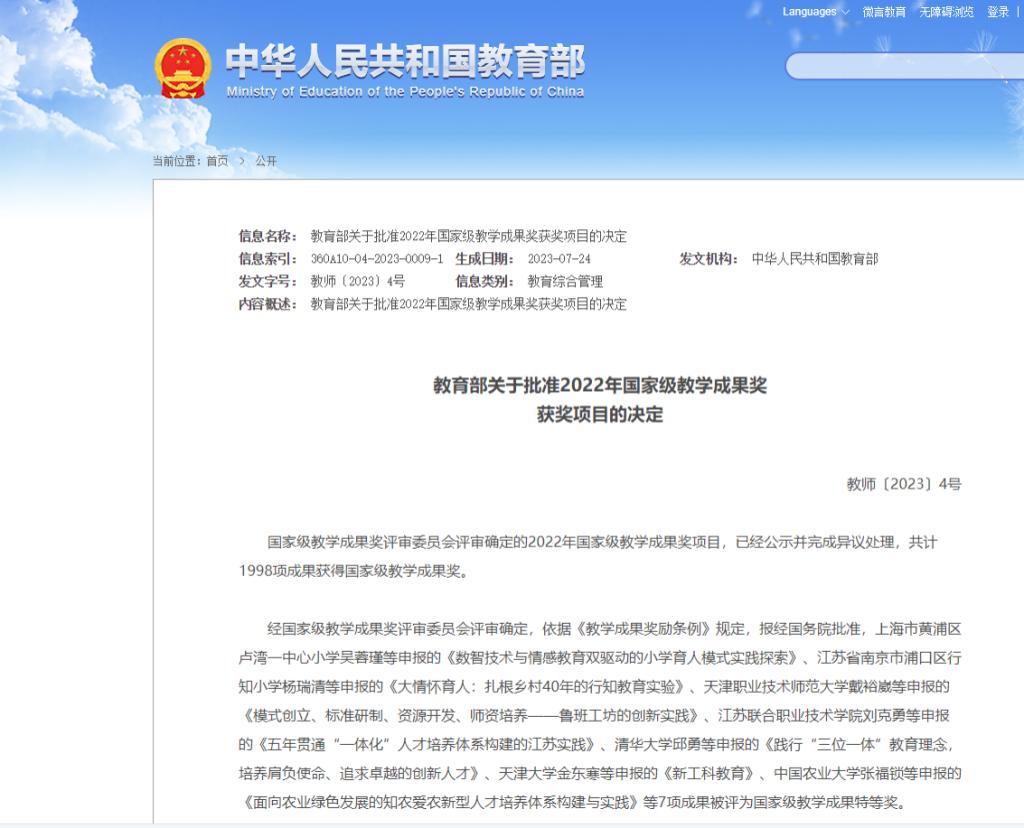 (本网讯 龙涛)近日,经国家级教学成果奖评审委员会评审确定,依据《教学成果奖励条例》规定,报经国务院批准,教育部发文《教育部关于批准2022年国家级教学成果奖获奖项目的决定》(教师〔2023〕4号),学校有两项成果荣获2022年职业教育国家级教学成果奖二等奖。