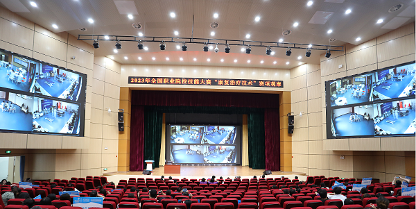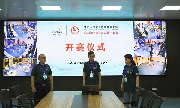 (本网讯 黄璐 邹雪萍 龚洪浪 杨毅 黄文军 熊元焕 罗华桥 肖俊春 龚晓斌 唐熙隆)7月29日,2023年全国职业院校技能大赛(高职组)康复治疗技术赛项技能操作竞赛在我校南区天工楼举行。赛前,在天工楼6楼举行了开赛仪式。159名选手在国赛赛场上比拼技能,展示风采。