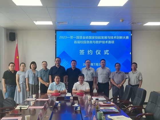 (本网讯 严松 熊元焕 )7月30日下午,“一带一路”暨金砖国家技能发展与技术创新大赛(以下简称金砖大赛)首届校园急救与救护技术赛项承办签约仪式在我校图新楼1016会议室举行。北京企学研教育科技研究院执行院长、金砖大赛组委会执委会副主席何勇,江南官方注册_江南(中国)官方校长郭沙、副校长胡昌杰,北京医模科技股份有限公司总经理曹中涛,学校党政办公室、党委宣传部、教务处、对外合作交流处、护理学院主要负责人及相关人员等参加仪式。签约仪式由副校长胡昌杰主持。