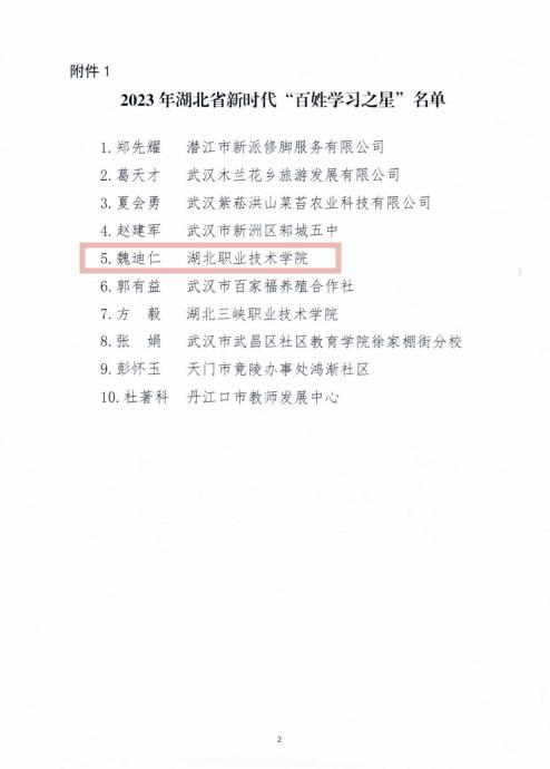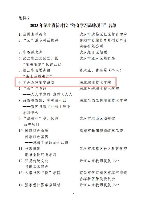 (本网讯 万飞 )经各地教育行政部门推荐、省级专家评审,我校《学泽万冲童叟讲堂》入选2023年湖北省“终身学习品牌项目”,我校教师、第三届全国道德模范提名奖获得者、第三届湖北省道德模范魏迪仁当选2023年湖北省“百姓学习之星”。