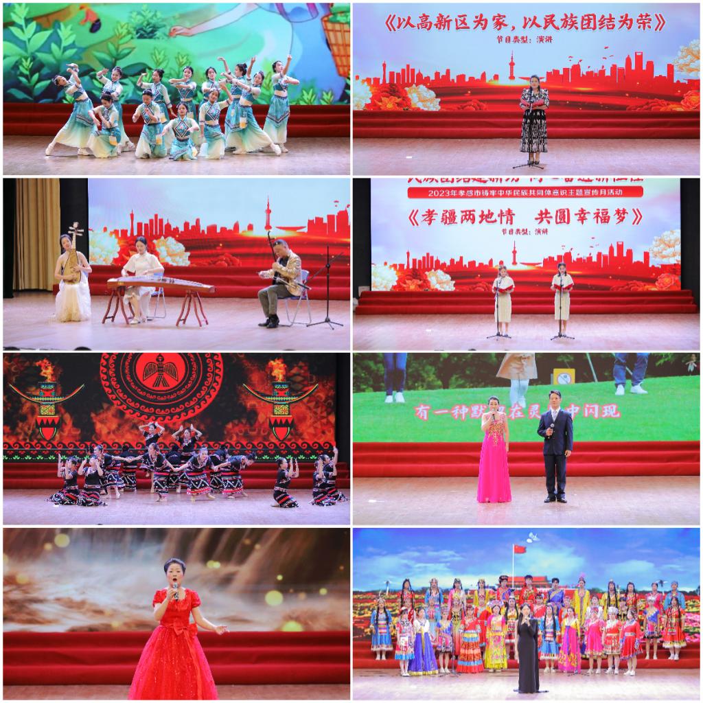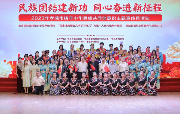 (本网讯 陈灏 汪胜祥 田勤 黄璐 孙永强 伍伶俐 熊元焕 张颖 黄雪倩 许雯霏 黄洪波 唐熙隆)共筑伟大中国梦,幸福花开石榴红。为全面贯彻落实习近平总书记关于加强和改进民族工作的重要思想,有形有感有效铸牢中华民族共同体意识,9月24日,孝感市“民族团结建新功 同心奋进新征程”铸牢中华民族共同体意识主题宣传月活动在我校隆重举行。省民宗委民族二处二级调研员李荣国,市委常委、统战部部长贺卫东,我校党委书记郭国文等出席活动并为获奖单位颁奖。