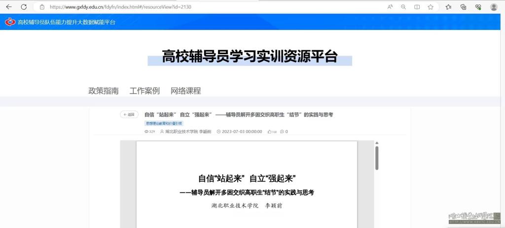 (本网讯 王宇阳)近日,信息工程学院辅导员李颖前撰写的案例《自信“站起来” 自立“强起来”——辅导员解开多困交织高职生“结节”的实践与思考》入选高校辅导员队伍能力提升大数据赋能平台(以下简称赋能平台)优质资源作品。