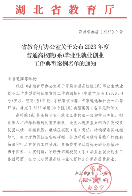 (本网讯 龙家宏)近日,湖北省教育厅公布了2023年湖北省普通高校院(系)毕业生就业创业工作典型案例征集结果,经学校推荐、专家推选、实地调研等环节,省教育厅遴选出30个典型案例。我校就业工作案例《组建市域产教联盟,引导毕业生到幼教基层就业》成功入选。