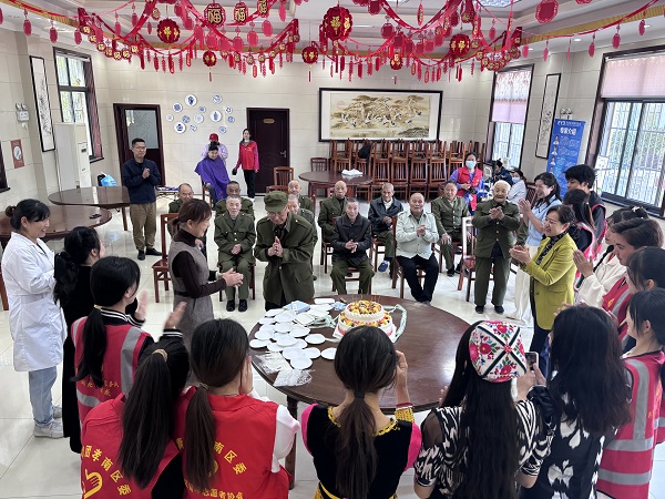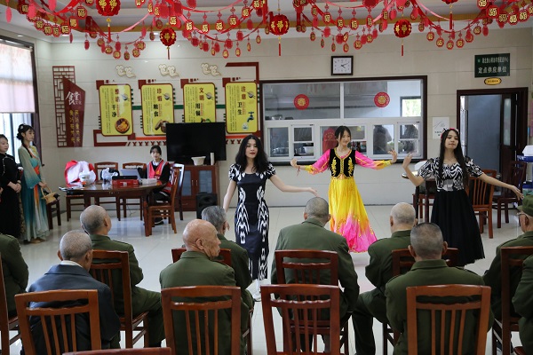 师生志愿者备好食材,来到孝感市孝南区光荣院,为老兵们包饺子。(专业)志愿者为老兵剪头发,检查眼睛。各族学生志愿者为爷爷奶奶们表演了精彩的节目,闫叶子朗诵了诗歌《读中国》,连舒畅、黄奕等同学演唱了雄壮的《强军战歌》,万张澄同学在杨菊英老师的伴奏下跳起了空灵鼓舞,阿依西瓦克等同学也跳起了欢快的民族舞。大家点燃了生日蛋糕上的蜡烛,唱起了生日快乐歌,一起祝福爷爷奶奶们幸福快乐,福寿安康!