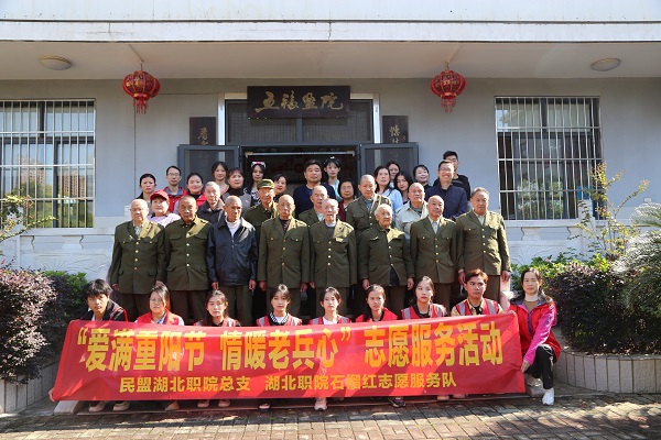 (本网讯 陈灏 肖俊春 吴婷)走近老兵,聆听英雄;情暖重阳,志愿同行。10月21日,民盟湖北职院总支、湖北职院石榴红志愿服务队等来到孝感市孝南区光荣院,开展了"爱满重阳节,情暖老兵心″敬老爱老助老志愿服务活动。民盟湖北职院总支主委邹雪萍,陈灏、余丽、吴婷、肖俊春、杨菊英等老师,各族学生志愿者,与孝南光荣院的老兵们度过了难忘的重阳节。孝南退役军人事务局等相关同志参加活动。