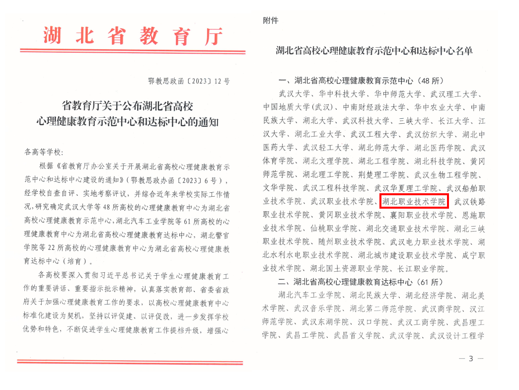 (本网讯 陈芷妍)10月19日,湖北省教育厅举行了全省高校学生心理健康教育建设成果交流研讨会,我校大学生心理健康教育中心获批湖北省高校心理健康教育示范中心。