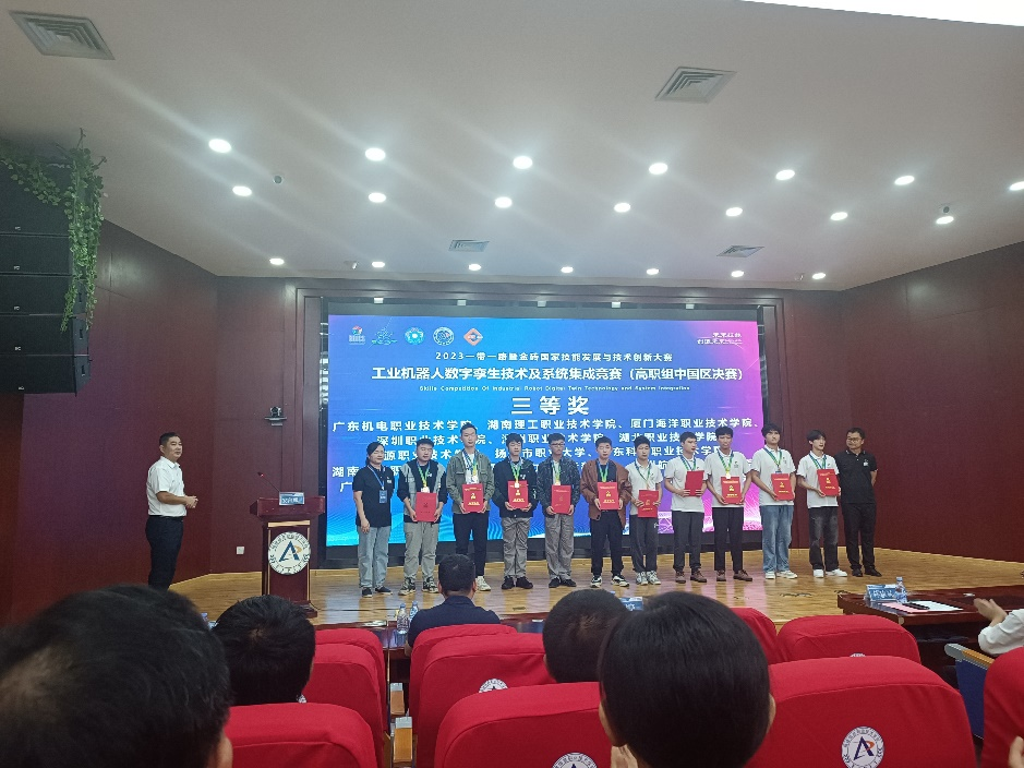 (本网讯 胡友前)10月17至20日,2023“一带一路”暨金砖国家技能发展与技术创新大赛“工业机器人数字孪生技术及系统集成”赛项决赛在福建信息职业技术学院(平潭校区)举行。来自全国的50余支代表队参加了本次大赛,经过激烈角逐,我校机电工程学院工业机器人技术专业的徐卓航、张子衡两名同学代表学校参赛荣获该赛项三等奖。