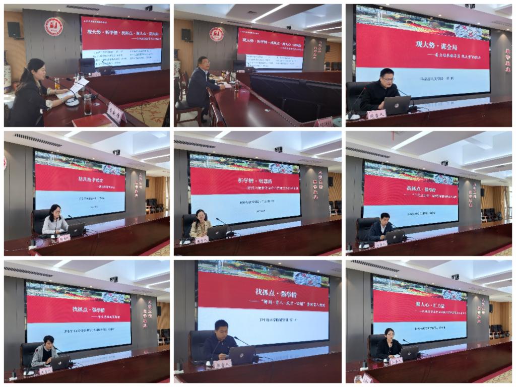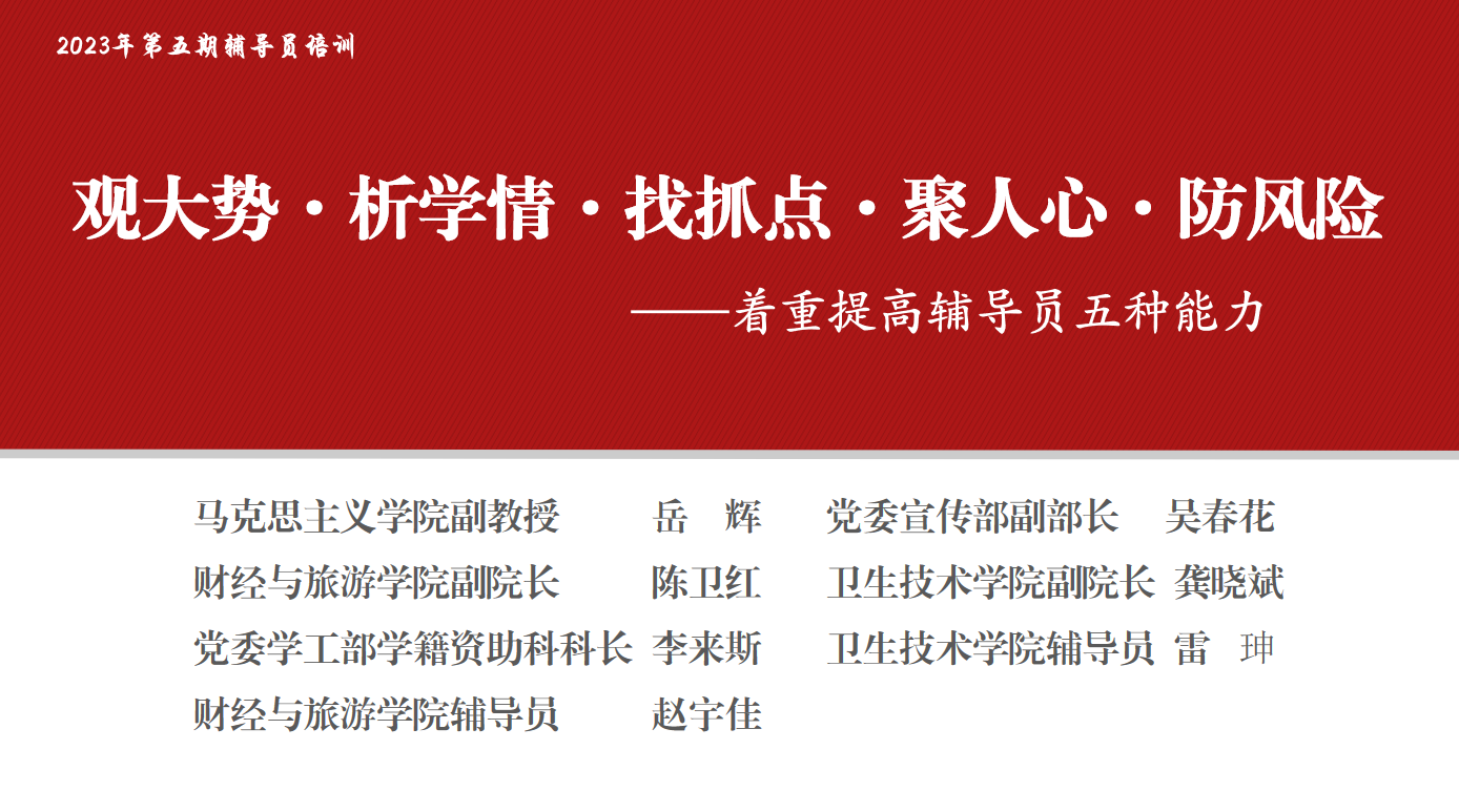 马克思主义学院副教授岳辉,党委宣传部副部长吴春花,财经与旅游学院副院长陈卫红、辅导员赵宇佳,卫生技术学院副院长龚晓斌、辅导员雷珅,党委学生工作部科长李来斯分别围绕“观大势·谋全局”“析学情·明思路”“找抓点·强举措”“聚人心·汇力量”“防风险·护稳定”,针对当前学生工作中面临的新情况新挑战,分析了学生的基本情况及问题、梳理了不同时间节点的八大类风险点、解析了国家资助政策、分享了“三化三到位”发展型资助育人模式、“解困-育人-成才-回馈”育人案例和班级凝聚力的经验作法。