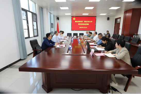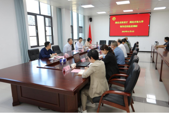 (本网讯 陈劼 )11月1日,湖北开放大学党委书记刘义、省教育厅高教处副处长饶贵安、湖北开放大学教务处处长王海洋、导学中心副主任周俐一行来校调研学校开放教育办学情况,学校党委书记郭国文、副校长杨立明等接待了客人一行。