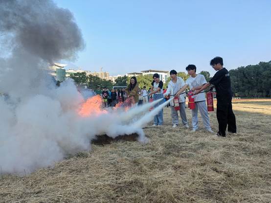 在做好防护措施的情况下,师生员工正确使用灭火器对模拟火情进行了实战扑灭演练。
