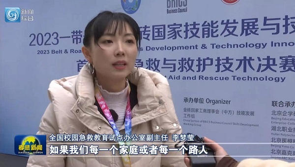 全国校园急救教育试点办公室副主任李梦莹在湖北职院南区崇德礼堂接受新闻媒体采访时强调,“如果我们每一个家庭或者每一个路人,都能够第一时间抓住黄金四分钟,对于这些心脏骤停或者需要急救的患者第一时间给予支持,很多生命是可以被挽救回来的,什么是最重要的,什么是最珍贵的,就是生命。我们经常说,教育一个孩子带动一个家庭,辐射整个社会”。