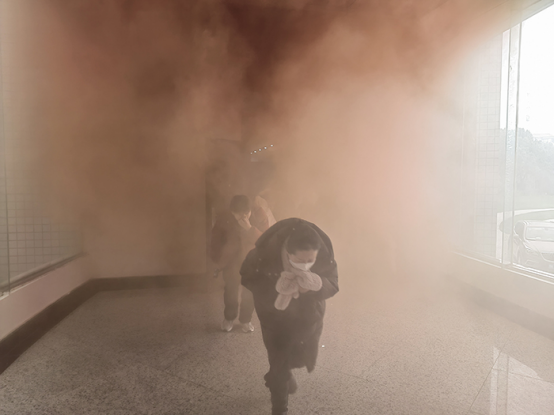 在灭火实操中,孙芳指导大家按照“提、拔、握、压”步骤来正确使用灭火器,提醒大家灭火时应站在上风或侧风位置进行灭火。在教官的指导下,每个人都进行了灭火全过程演练。