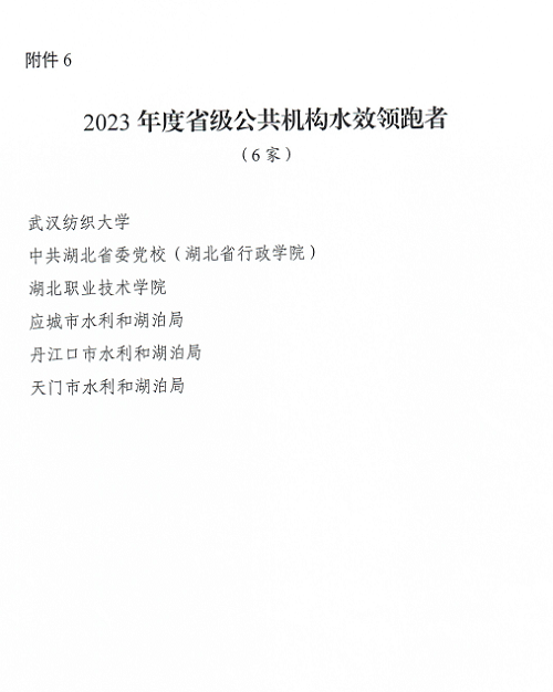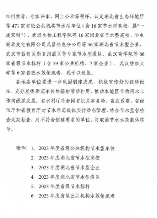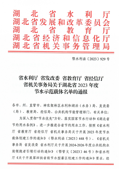 (本网讯 高佩 段劲芳)为深入贯彻“节水优先”方针,落实国家节水行动和《湖北省节约用水条例》,进一步推进全省节约用水工作,按照《省水利厅 省教育厅 省经信厅 省机关事务局关于开展2023年度节水示范载体创建工作的通知》(鄂水利函〔2023〕448号)和《省机关事务局 省发改委 省水利厅关于开展2024-2026年度公共机构水效领跑者引领行动的通知》要求,经学校申报、孝感市初审推荐、省专家评审、网上公示等程序,近日,学校被湖北省水利厅、省发改委、省教育厅、省机关事务局认定为“2023年度省级水效领跑者”。全省获此殊荣单位共6个,其中高校2所。