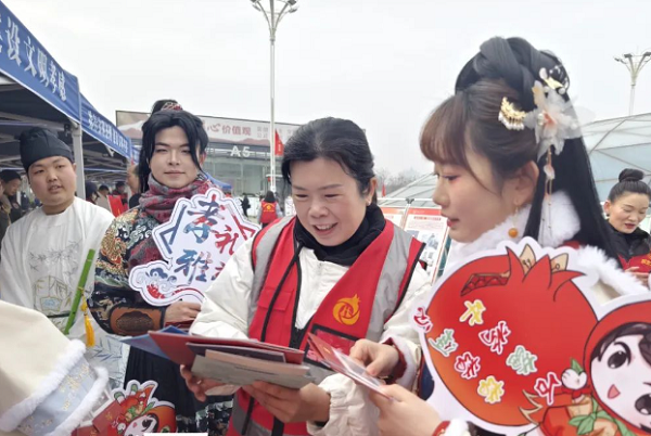(我校荆楚石榴红志愿服务队余丽老师在孝感东站广场“志愿服务赶大集”现场与各族青年交流)