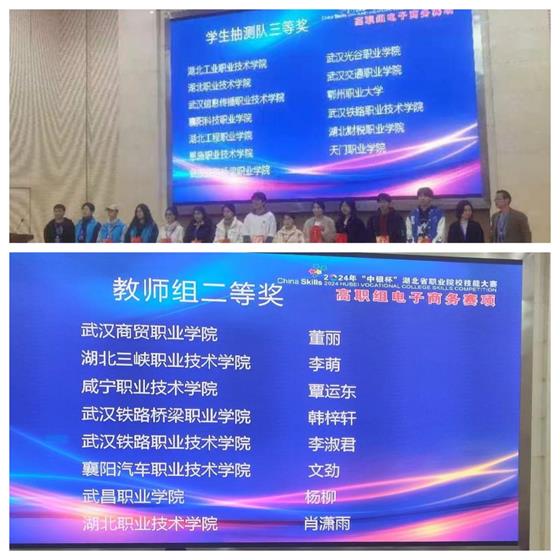 (本网讯 宋巍)近日,2024年“中银杯”湖北省职业院校技能大赛(高职组)“电子商务技能”赛项在襄阳落下帷幕。财经与旅游学院电子商务专业2021级学生林炜2022级学生刘书城、刘璇、冷泽文组成的推荐队获推荐组一等奖,高娜娜、杨文娟、杨玉婷、李盈盈组成的抽测队获抽测组三等奖。电子商务专业教师肖潇雨获教师组二等奖,同时荣获“优秀指导老师奖”。