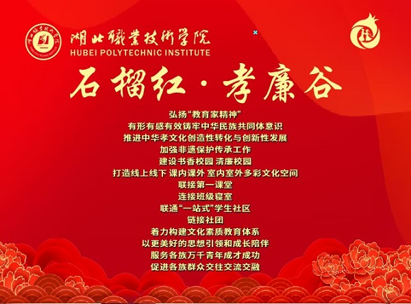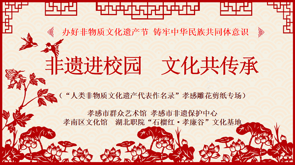 在孝感市群众艺术馆、孝感市非遗保护中心、孝南区文化馆等支持下,我校开设了非物质文化遗产保护相关或相近专业和课程,非遗传承人常态化走进课堂,孝文化传承与教育基地获评湖北省社科普及教育基地,“石榴红·孝廉谷”文化基地登上了央视1频道《等着我》栏目。湖北职院的“非遗节”纳入了全校科技文化体育艺术节、职业教育活动周。