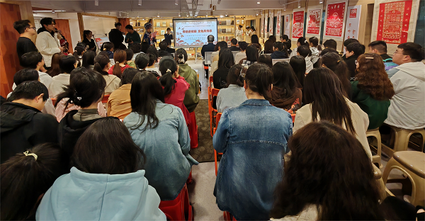 省级非遗代表性传承人徐惠斌团队进行了别开生面的“孝感雕花剪纸”学术讲座,现场座无虚席。徐惠斌老师以《中国剪纸艺术》为题,从“历史起源”、“创作素材”、“创作特点”等方面介绍“孝感雕花剪纸”这一古老工艺,结合自己三十余年创作实践,演绎“传统”和“创新”的关系。徐惠斌老师的讲解深入浅出,不仅详细介绍了孝感雕花剪纸的历史渊源、艺术特色、题材应用、创作理念和制作工艺,还展示了有关民俗民风的鞋花、枕花、帽花纹样实物和他创作的十余幅优秀艺术作品,现场精彩互动,师生受益匪浅。