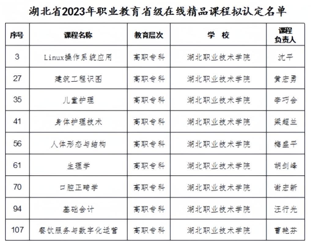 (本网讯 刘华)根据教育部和教育厅关于2023年职业教育国家在线精品课程遴选工作要求,2024年3月12日湖北省教育厅公示《湖北省2023年职业教育省级在线精品课程拟认定名单》《湖北省2023年职业教育国家在线精品课程拟推荐名单》,现公示期已满。我校Linux操作系统应用、建筑工程识图、儿童护理等9门课程获省级在线精品课程认定,Linux操作系统应用、建筑工程识图、儿童护理、餐饮服务与数字化运营4门课程获推荐参加国家在线精品课程评选。