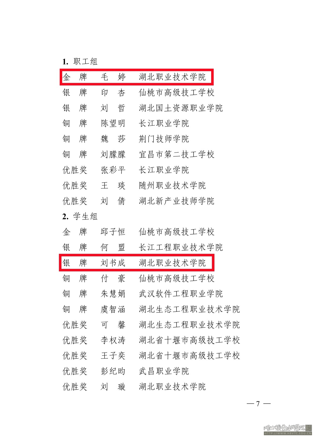 我校获得“两金”“两银”的好成绩。其中,教育与艺术学院学生组刘芊获“育婴员”项目全省金奖,王叶老师获得职工组银奖;财经与旅游学院职工组毛婷老师获得“电子商务”项目金奖,学生组刘书成获得银奖。财经与旅游学院毛婷老师、教育与艺术学院学生刘芊将代表湖北队参加全国大赛。经学校推荐、专家审核,确定肖成林、宗敏、肖敏晨、张玉洁、黄宏勇等5名同志为项目裁判。