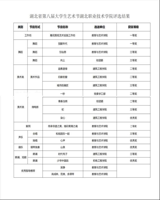 (本网讯 冷玖玲)湖北省第八届大学生艺术节评比结果于近日在湖北省教育厅网站公示,我校共获得一等奖2个、二等奖5个、三等奖6个、优秀奖4个、优秀指导教师4名,获奖质量、数量、类别均取得新突破。