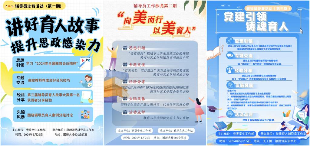 本次辅导员工作沙龙聚焦党建育人,包括思想引领、专题交流、经验分享、头脑风暴、活动点评五个环节。