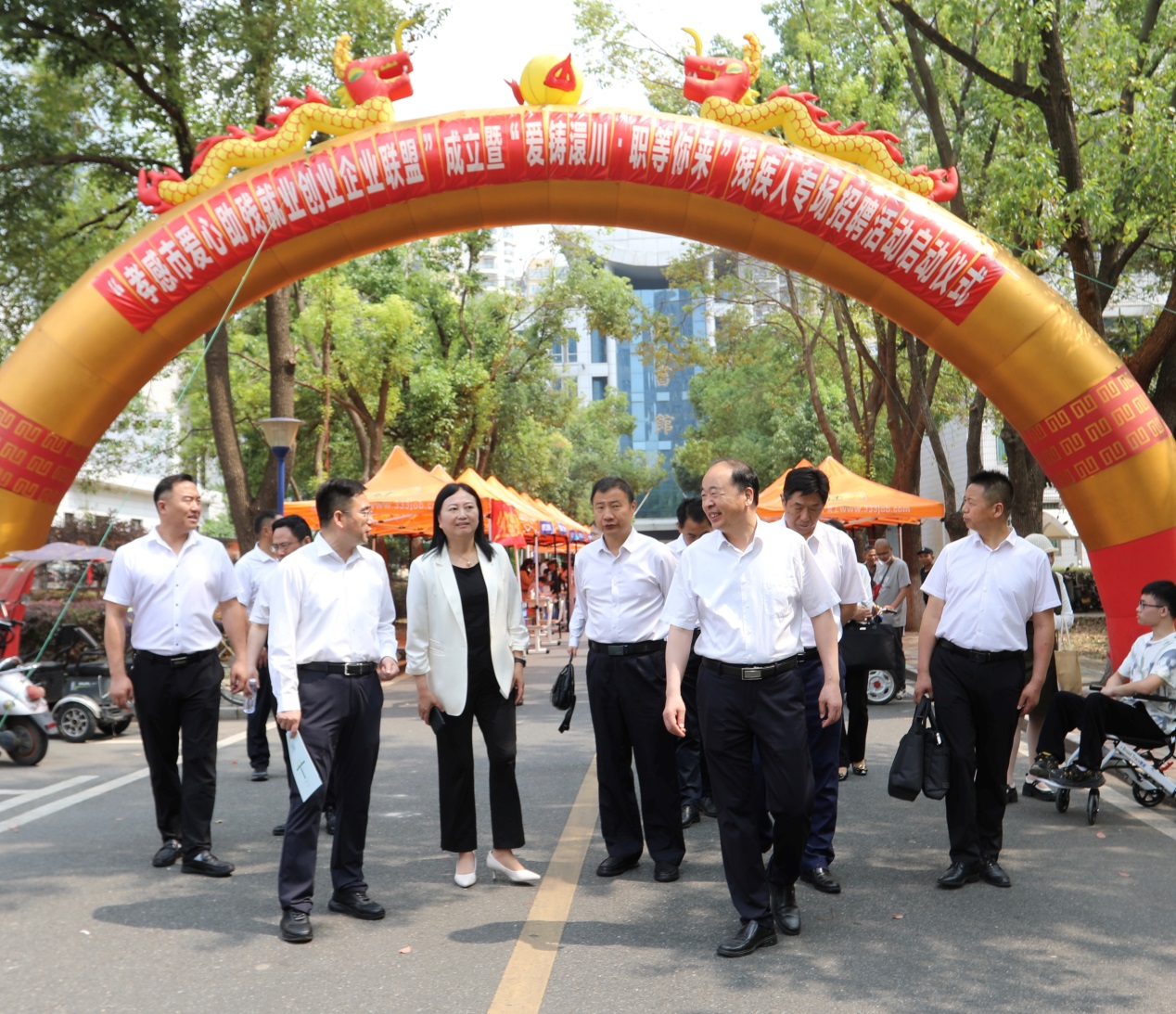 (本网讯 艾欢)6月6日,“孝感市爱心助残就业创业企业联盟”成立暨“爱铸澴川·职等你来”残疾人专场招聘活动启动仪式在我校举行。省残联党组成员、副理事长毛建东,市政府副市长、市残工委主任石必成,市政协副主席、市工商联主席陈鸿杰,学校党委书记郭国文,市政府副秘书长蔡国平,市残联党组书记、理事长朱丽玲等出席活动,并为联盟首批成员单位、副主席单位和主席单位授牌。