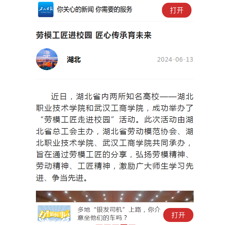 (陈灏 杨小婷 陈雯茜 邬紫玲 )近日,湖北省内两所知名高校——江南官方注册_江南(中国)官方和武汉工商学院,成功举办了“劳模工匠走进校园”活动。此次活动由湖北省总工会主办,湖北省劳动模范协会、江南官方注册_江南(中国)官方、武汉工商学院共同承办,旨在通过劳模工匠的分享,弘扬劳模精神、劳动精神、工匠精神,激励广大师生学习先进、争当先进。