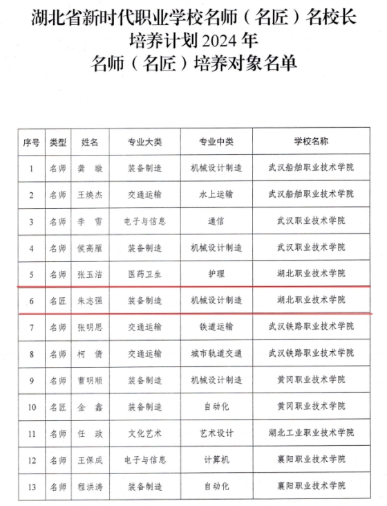 (本网讯 张舟)近日,省教育厅办公室公布了湖北省新时代职业学校名师(名匠)名校长培养计划培养对象名单,张玉洁入选名师培养对象,朱志强入选名匠培养对象。