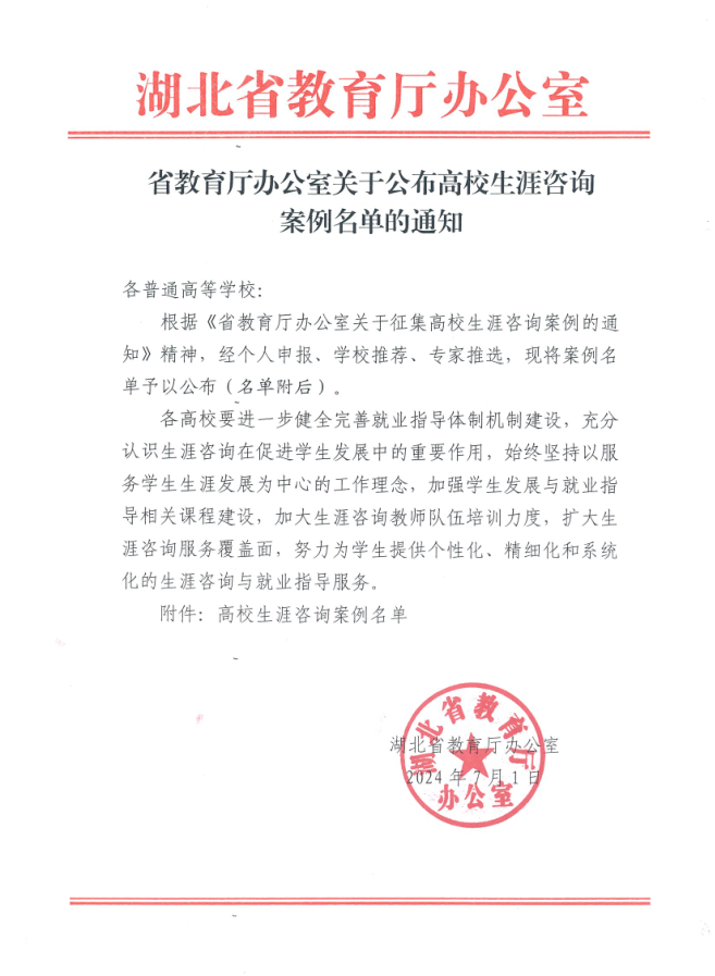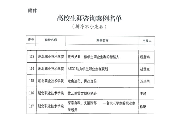 (本网讯 龙家宏)近日,湖北省教育厅公布了2024年湖北省高校生涯咨询案例名单,我校5个优秀案例成功入选。