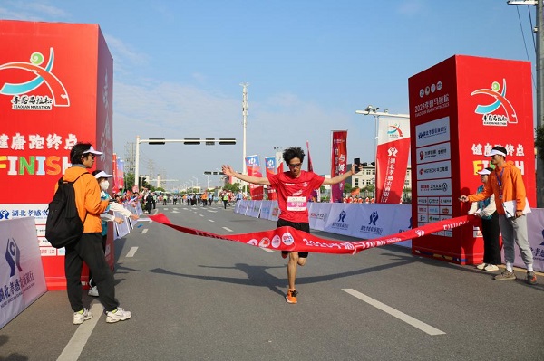 2023年孝感马拉松,在10公里健康跑项目中,我校口腔医学院2021级口腔医学专业学生刘佳成、建筑工程学院2021级工程造价专业学生汪鑫荣获10公里健康跑项目冠亚军,图为刘佳成冲过终点。