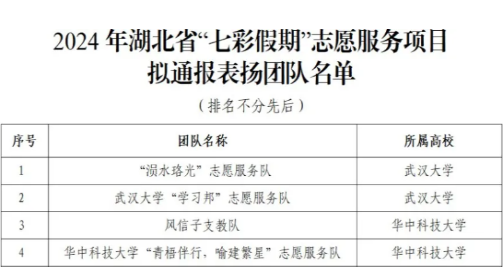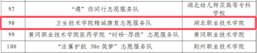 (本网讯 雷珅)11月15日,接湖北省志愿者协会通报,卫生技术学院精诚康复志愿服务队获评2024年湖北省“七彩假期”志愿服务项目优秀志愿服务团队。
