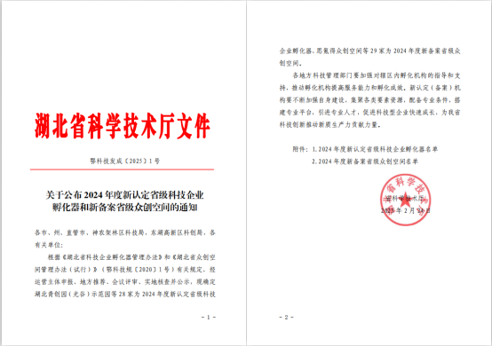 (本网讯 艾欢 黄灿)2月24日,湖北省科技厅公布了《关于公布2024年度新认定省级科技企业孵化器和新备案省级众创空间的通知》,我校创业孵化基地经组织申报、市科技局审核推荐、省科技厅实地核查等环节,成功备案省级众创空间。这是学校继2023年备案市级众创空间、2024年获批省级创业孵化示范基地后,在创新创业平台建设上取得的又一新突破。