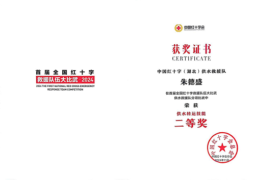 首届中国红十字救援队伍大比武活动于2024年8月至10月在6个省份陆续开展,来自全国的58支代表队共计500余名队员参加了供水、大众卫生、医疗、搜救等8个分项的大比武。在8月19日至23日云南昭通举行的第一届中国红十字供水救援队大比武活动中,我校朱德盛同志作为湖北供水救援队核心队员先后参加团体和个人竞赛,在激烈角逐中充分展现了精湛的救援技能和良好的精神风貌,并以第二名的成绩获得供水救援队分项比武供水转运技能二等奖。朱德盛同志以实际行动弘扬了奉献、友爱、互助的志愿服务精神,也向全社会展示了湖北职院人的大爱与风采。