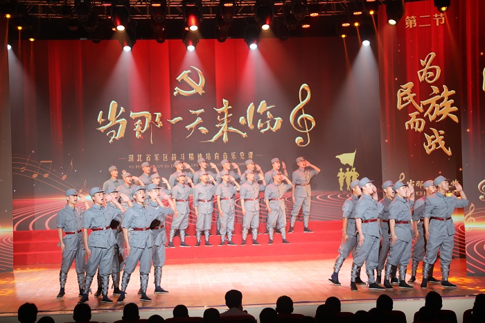 (本网讯 陈灏 )6月13日晚,湖北省军区“当那一天来临”红色音乐党课在我校崇德礼堂举行,“声”入人心,“燃”爆全场,好评如潮。省委常委、省军区司令员郦斌,孝感市人民政府市长吴庆华,孝感市委常委、组织部长杭莺,孝感市委常委、孝感军分区司令员曾凡笋,孝感军分区政治委员刘刚,我校党委书记郭国文、校长郭沙等出席活动。湖北省军区学习贯彻习近平新时代中国特色社会主义思想理论培训全体参训学员、我校师生代表近1000人共享“大思政课”,赓续红色基因,奋进支点建设。