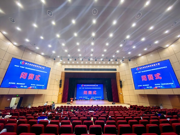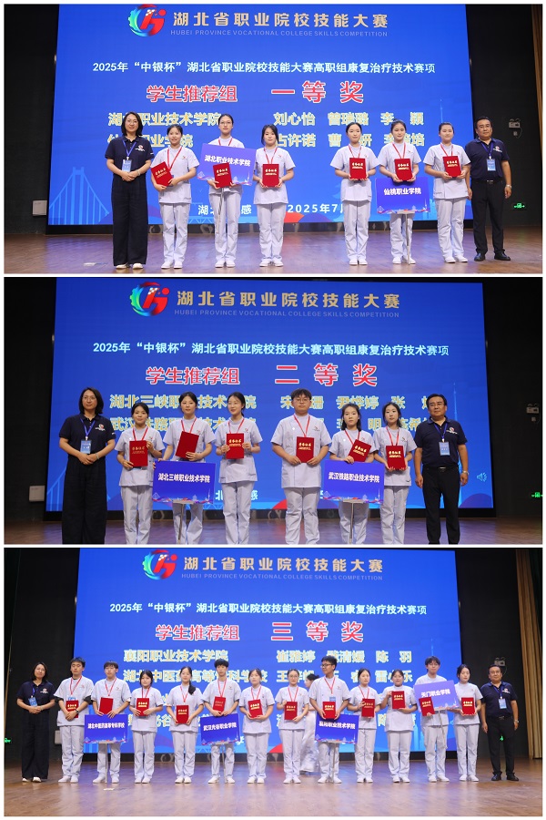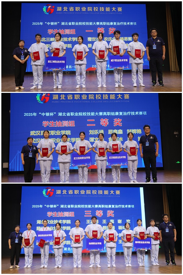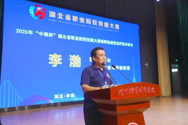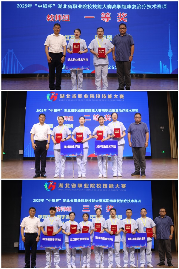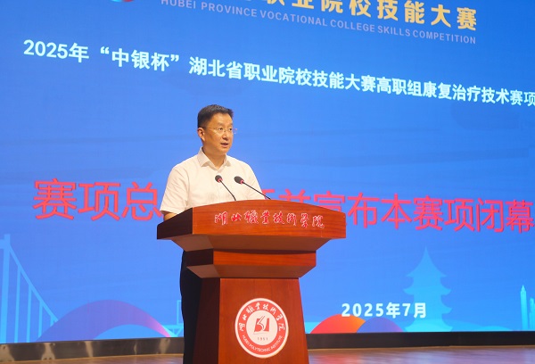 (本网讯 曾欢 陈文培 黄文军 陈灏)7月1日下午,2025年“中银杯”湖北省职业院校技能大赛高职组康复治疗技术赛项颁奖典礼暨闭幕式在我校南校区崇德礼堂举行。湖北省职业院校技能大赛执委会办公室卢靖、赛项裁判长李渤、赛项专家组长邹颖、赛项监督长简亚平、赛项仲裁长李艳、我校校长郭沙等出席闭幕式并颁奖。副校长胡昌杰主持颁奖典礼暨闭幕式。