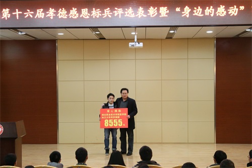 会上,学校党委书记蔡诗红、副校长梅重、先进模范代表左德汉分别为受表彰的先进集体和先进个人颁奖。医学院党总支书记刘秀平代表医学院师生再次向患病学生王少华进行了爱心捐款。