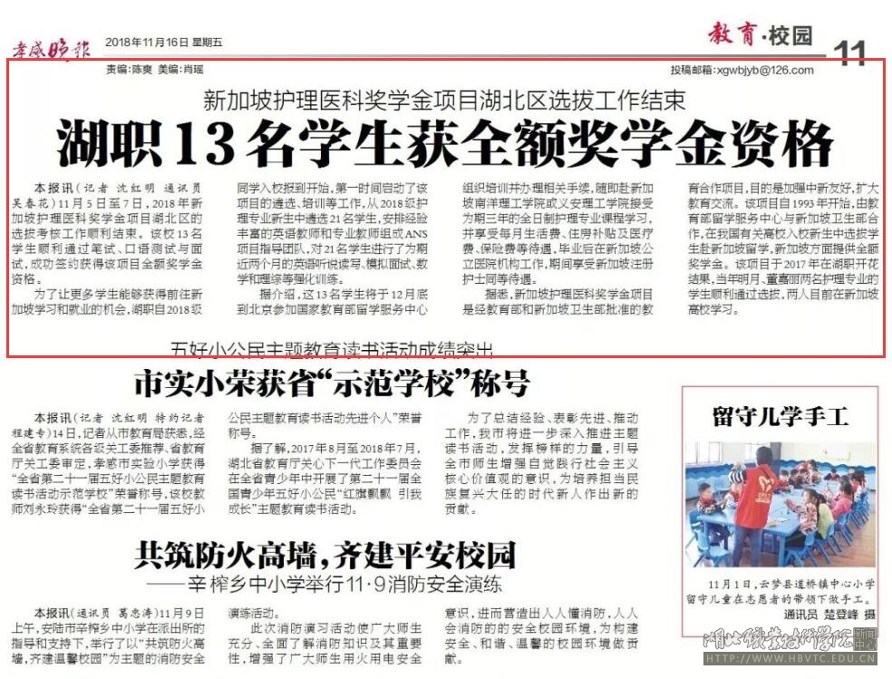 【孝感晚报】湖职13名学生获全额奖学金资格