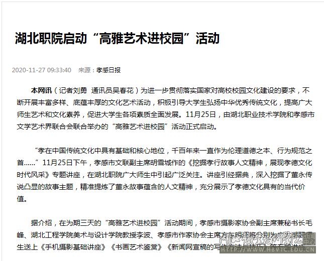 据介绍,在为期三天的“高雅艺术进校园”活动期间,孝感市摄影家协会副主席兼秘书长毛峰、湖北工程学院美术与设计学院教授李波、孝感市作家协会主席方东明还将分别为广大湖职师生送上《手机摄影基础讲座》《书画艺术鉴赏》《新闻网宣稿的写作方法与技巧》等专题讲座。