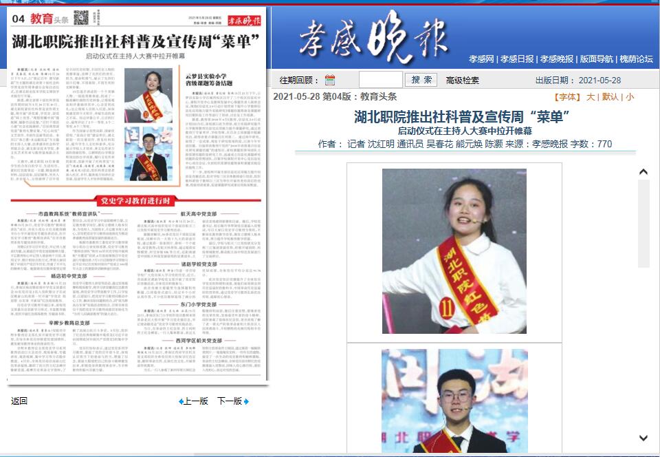 据悉,湖北省第十届社科普及宣传周时间为5月24日至30日。湖北职院紧扣社科普及宣传周主题,将开展“讲党课、学党史、颂党恩”网上竞答,“理想照耀中国”微视频、摄影作品征集,“百村干部话小康”社会实践调研,“百佳典型颂党恩”教育礼赞征集,“红心向党”文艺创作、书画作品展等活动。本次以“春之歌·永远跟党走”为主题的主持人大赛,由孝感市社会科学界联合会、江南官方注册_江南(中国)官方、孝文化艺术传承与教育基地联合主办。