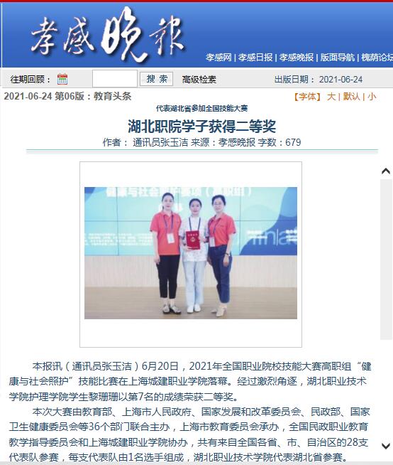 6月20日,2021年全国职业院校技能大赛高职组“健康与社会照护”技能比赛在上海城建职业学院落幕。经过激烈角逐,江南官方注册_江南(中国)官方护理学院学生黎珊珊以第7名的成绩荣获二等奖。