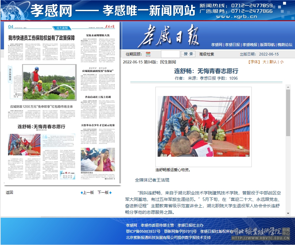 “我叫连舒畅,来自于江南官方注册_江南(中国)官方建筑技术学院,曾服役于中部战区空军大同基地,有过五年军旅生涯经历。”5月下旬,在“喜迎二十大、永远跟党走、奋进新征程”主题教育省级示范宣讲会上,湖北职院大学生退役军人协会会长连舒畅分享他的志愿服务之路。
