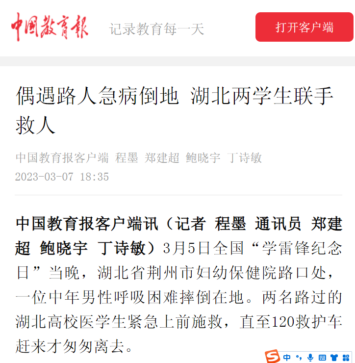中国教育报客户端讯(记者 程墨 通讯员 郑建超 鲍晓宇 丁诗敏)3月5日全国“学雷锋纪念日”当晚,湖北省荆州市妇幼保健院路口处,一位中年男性呼吸困难摔倒在地。两名路过的湖北高校医学生紧急上前施救,直至120救护车赶来才匆匆离去。