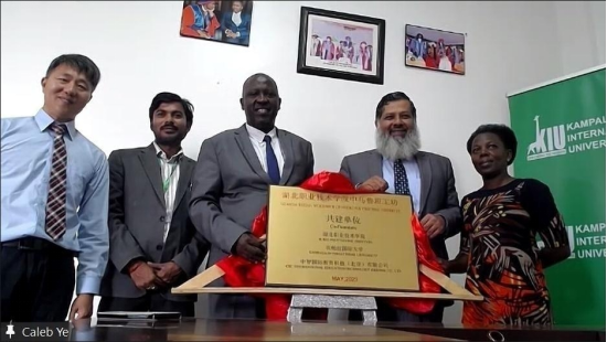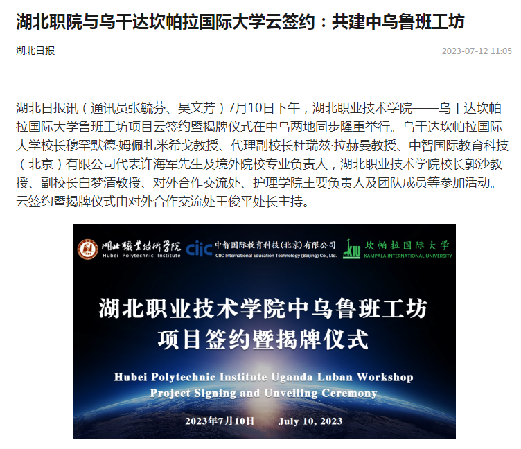 湖北日报讯 (通讯员 张毓芬 吴文芳)7月10日下午,江南官方注册_江南(中国)官方——乌干达坎帕拉国际大学鲁班工坊项目云签约暨揭牌仪式在中乌两地同步隆重举行。乌干达坎帕拉国际大学校长穆罕默德·姆佩扎米希戈教授、代理副校长杜瑞兹·拉赫曼教授、中智国际教育科技(北京)有限公司代表许海军先生及境外院校专业负责人,江南官方注册_江南(中国)官方校长郭沙教授、副校长白梦清教授、对外合作交流处、护理学院主要负责人及团队成员等参加活动。云签约暨揭牌仪式由对外合作交流处王俊平处长主持。